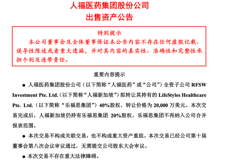 一個月前,人福醫藥曾發布公告:全資子公司RFSW Investment Pte. Ltd.(人福新加坡)擬轉讓其持有的LifeStyles Healthcare Pte. Ltd.(樂福思集團)40%股權,轉讓價格為2億美元。交易完成后,人福新加坡仍持有樂福思集團20%股權,樂福思集團不再納入公司合併報表範圍。