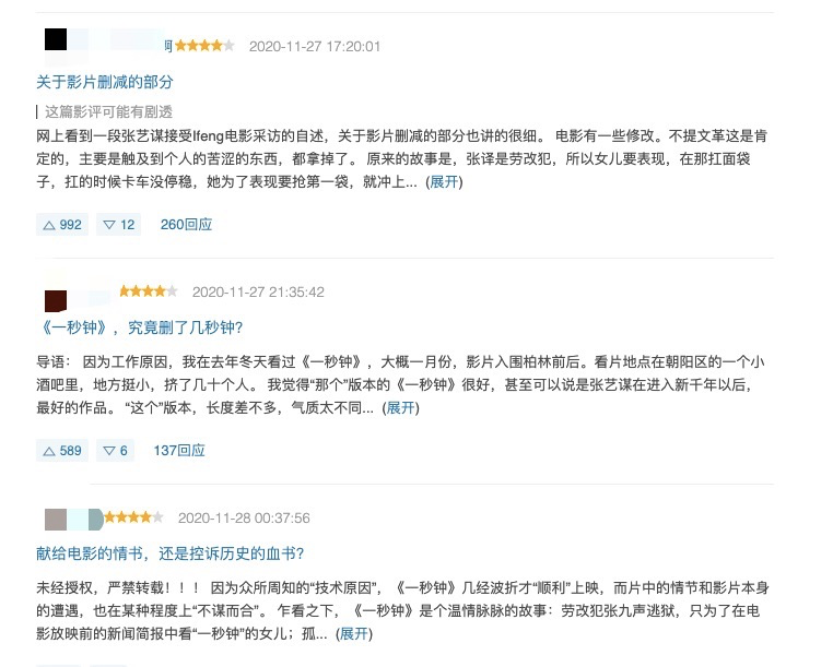 《一秒鐘》上映之後,兩個電影相關話題迅速在影迷圈層引起討論。
