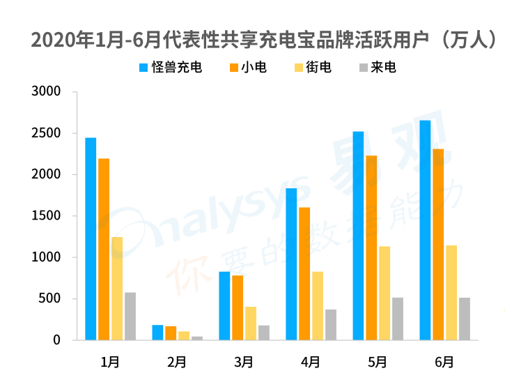 受疫情影響,今年2月份,各大共享充電寶品牌的活躍用戶均降至冰點,4月份,活躍用戶便逐步復蘇。到了五六月份時,怪獸充電等企業已經超過去年同期水平,而來電的復蘇顯得遲緩許多。