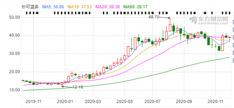 不管怎麼說,這筆交易還是讓妙可藍多吃到不少“甜頭”,其股價從1月初的14元/股左右一度漲至8月7日盤中最高49.7元/股,漲幅超過200%。即便後續因收購中止等原因遭遇大幅回撤,目前股價仍停留在39元/股的相對高位。