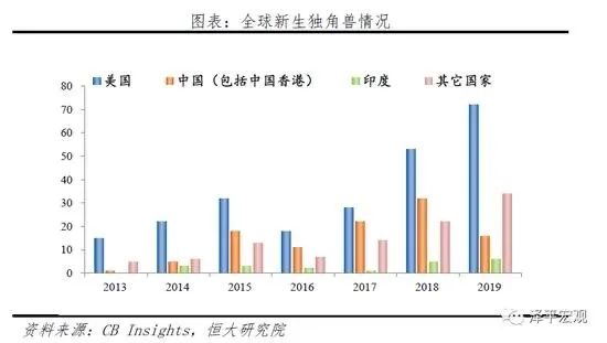 數據显示,2019年創投圈融到錢的項目越來越少。2019年前11個月僅有5387家企業拿到了融資,不足去年的1/2,整體融資規模也在下跌。投資項目減少,獨角獸更加稀缺,2019年全球新生獨角獸共128家,美國、中國、印度排前三,但我國新生獨角獸數量較2018年減少了50%。