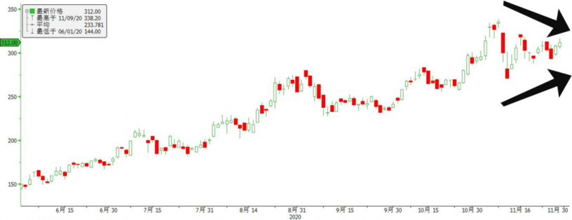 11月27日,是反垄斷指南消息傳出后的第14個股票交易日。被機構大幅加倉、年均漲幅一度超過220%的美團,在受利空影響的連續兩日陰跌后,用這14個交易日走出了神奇的倒三角形K線走勢。