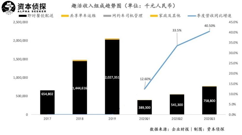 三季度,趣活實現營收7.7億人民幣,同比增長20.8%,其中即時餐飲配送業務佔比98.6%;
