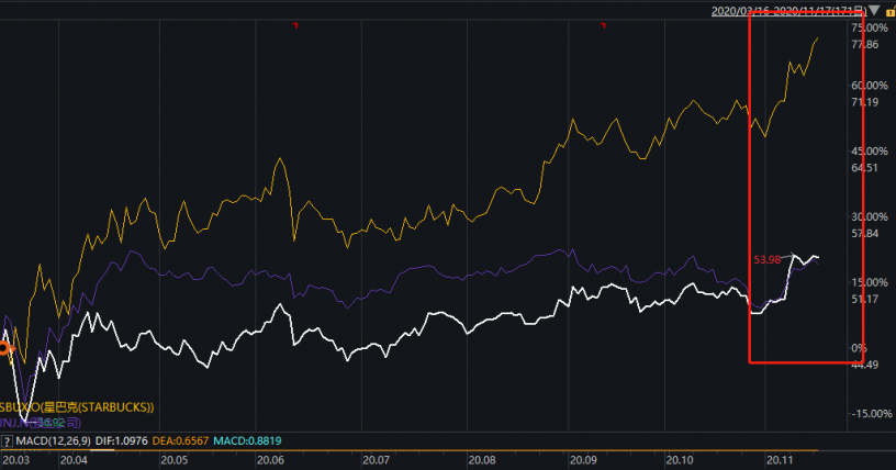 圖1:可口可樂、星巴克、強生等消費股11月以來強勢拉升