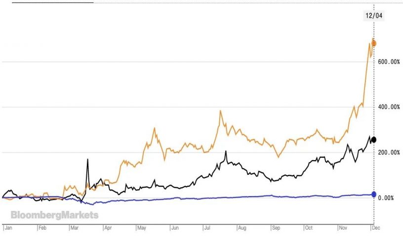 圖:截至12月2日,莫德納股價年內漲幅達到679.75%,拜恩泰科年內漲幅為255.38%,均遠超過標普500指數年內14.5%的漲幅。黃線為莫德納,黑線為拜恩泰科,藍線為標普500指數