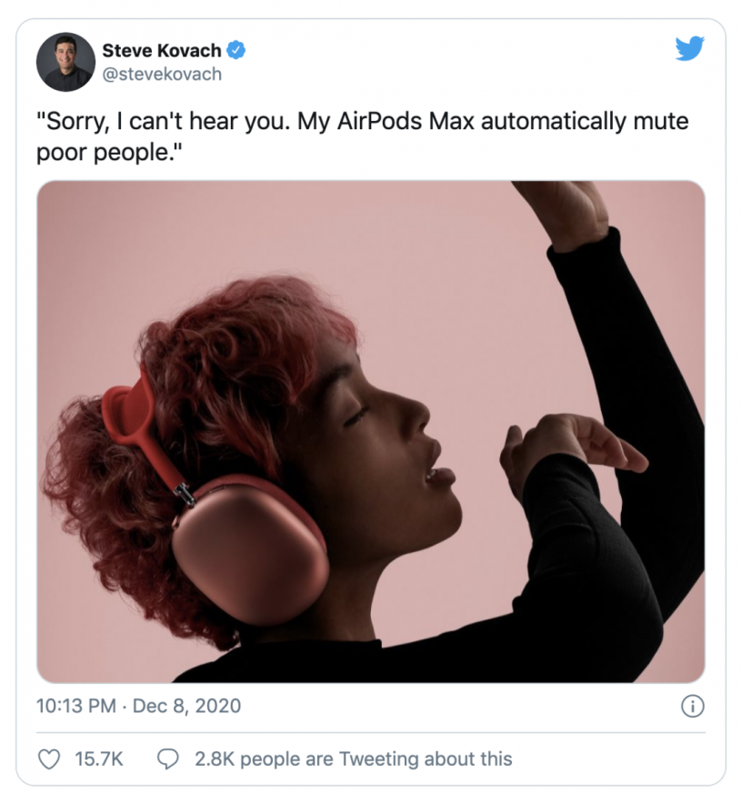 “對不起,我聽不見你說話哦。我的 AirPods Max 會自動屏蔽窮人的聲音。”