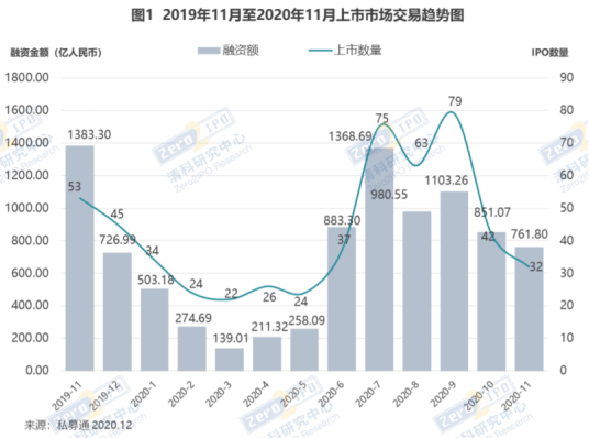 根據清科旗下私募通數據显示,2020年11月共有32家中國企業[1]在全球各交易市場完成IPO,同環比均大幅下降,下降比例分別為39.62%和23.81%。從融資金額上看,本月中企IPO總融資額為761.80億人民幣,同比下降44.93%,環比下降10.49%。本月完成IPO的中企涉及13個一級行業,登陸6個交易市場。中企IPO平均融資額為23.81億人民幣,環比增長17.48%,單筆最高融資額為131.98億人民幣,最低融資額為1.17億人民幣。本月共有20家VCPE已投企業上市,涉及101家機構,VC/PE滲透率為62.50%。本月融資金額最大的三家IPO企業均為二次上市,分別為:中金公司在上海交易所主板上市共融資131.98億人民幣,萬國數據在香港證券交易所主板上市共融資112.22億人民幣,新東方在港交所主板上市共融資86.58億人民幣。