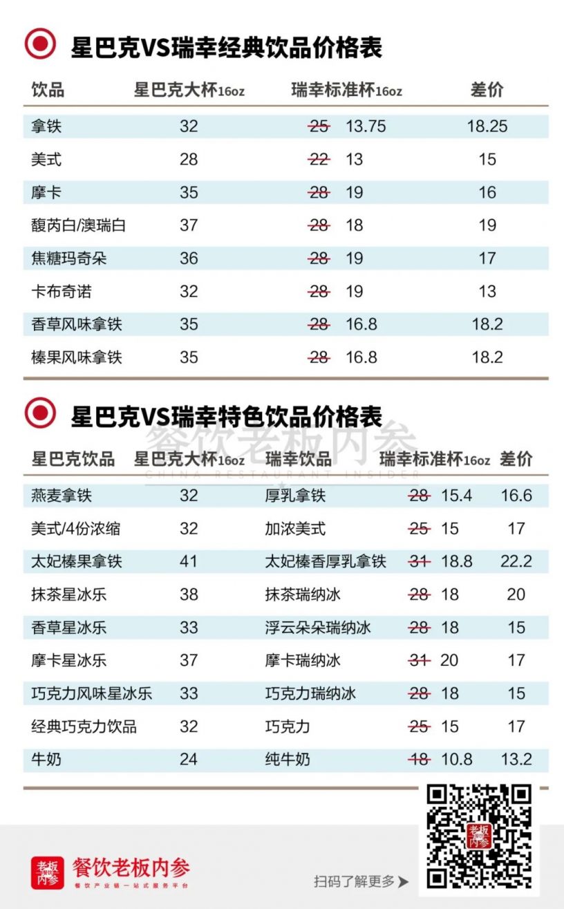 內參君簡單統計出了一份星巴克和瑞幸主要產品價格表,可以明顯看出來,兩者相同或相似的咖啡飲品,瑞幸都要比星巴克價格低上40%-50%,差價普遍在15元-20元之間。