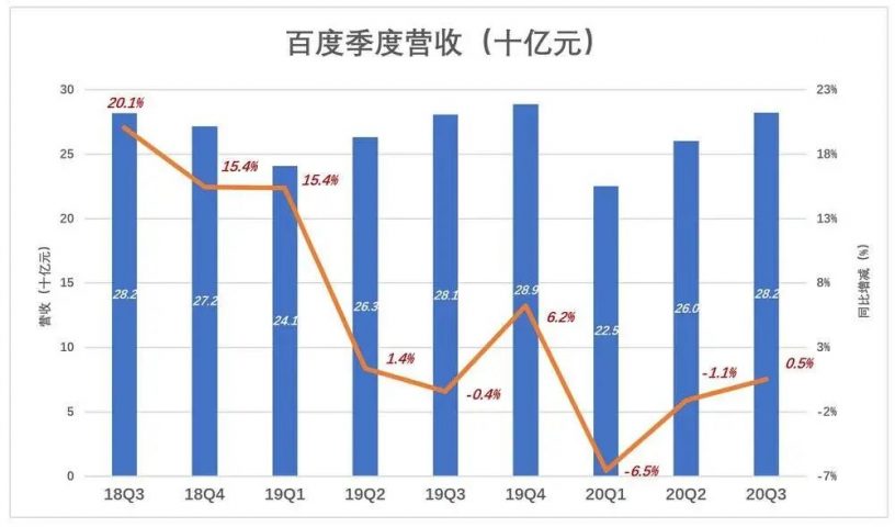 2020年Q3,營收282億、同比增長0.5個百分點,與2018年Q3並列為“百度史上最賺錢第三季”。
