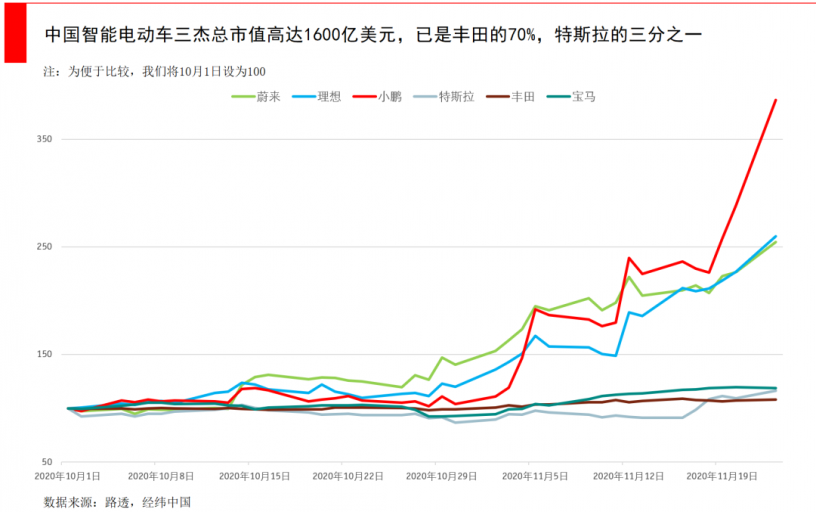 我們自己雖然很看好,對這種短時間內的股價漲幅也十分吃驚。如果硬要尋找理由,那可能跟市場突然認可了電動車的遠期潛力、中國和歐洲大力推行電動車替代燃油車、美國下一任總統拜登大力支持新能源、中概股越來越變成了一個外在的“科創板”等等因素有關,但這些都只是事後諸葛亮。