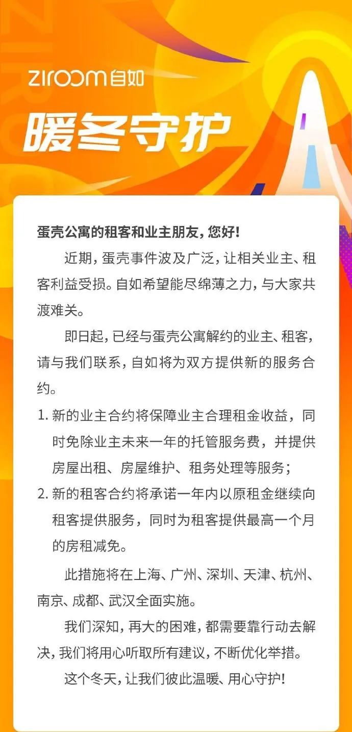 同一天,蛋殼的對手自如也正式宣布,願幫助受蛋殼公寓事件影響的業主和租客共渡難關,針對蛋殼公寓的業主和租客已開展專項扶持。