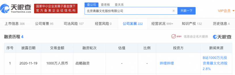11月19日消息,天眼查App显示,近日,北京青藤文化股份有限公司獲B站1000萬元人民幣戰略投資,本次將用於補充青藤文化的運營流動資金,緩解現有業務規模擴張帶來的資金壓力。