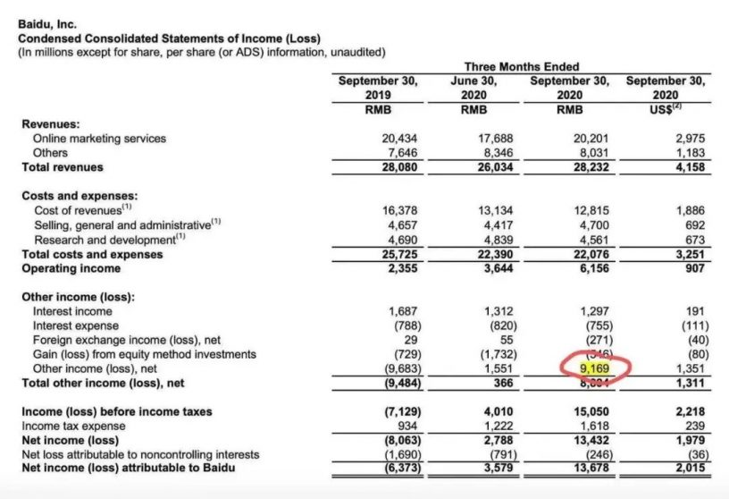 簡單來說,就是百度對外投資的股權、債券等收益增加了,而Q3這一金額高達 90 億元。