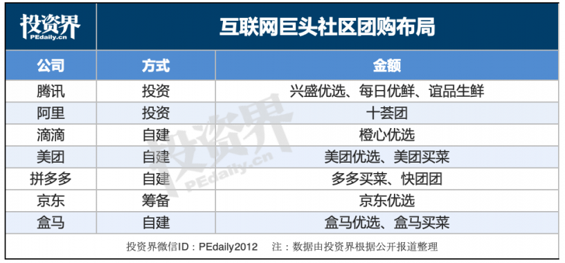 在繼滴滴推出橙心優選和美團推出美團優選之後,拼多多、阿里、京東等電商巨頭也紛紛挺進:拼多多於8月份加入戰局,在武漢、南昌等地上線多多買菜;9月中旬,阿里麾下的盒馬成立盒馬優選事業部,預計11月在武漢開團;11月,京東內部正在籌劃社區團購項目“京東優選”,由京東物流和京東商城聯合打造,今年底或明年初正式上線。